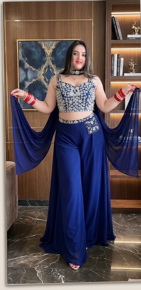 Make a statement of timeless elegance with our Royal Midnight Blue 3-Piece Indo-Western Set, designed to blend traditional charm with contemporary flair. This stunning ensemble features a beautifully embellished crop top, flowy palazzo pants, and a sheer draped dupatta that adds graceful movement to every step